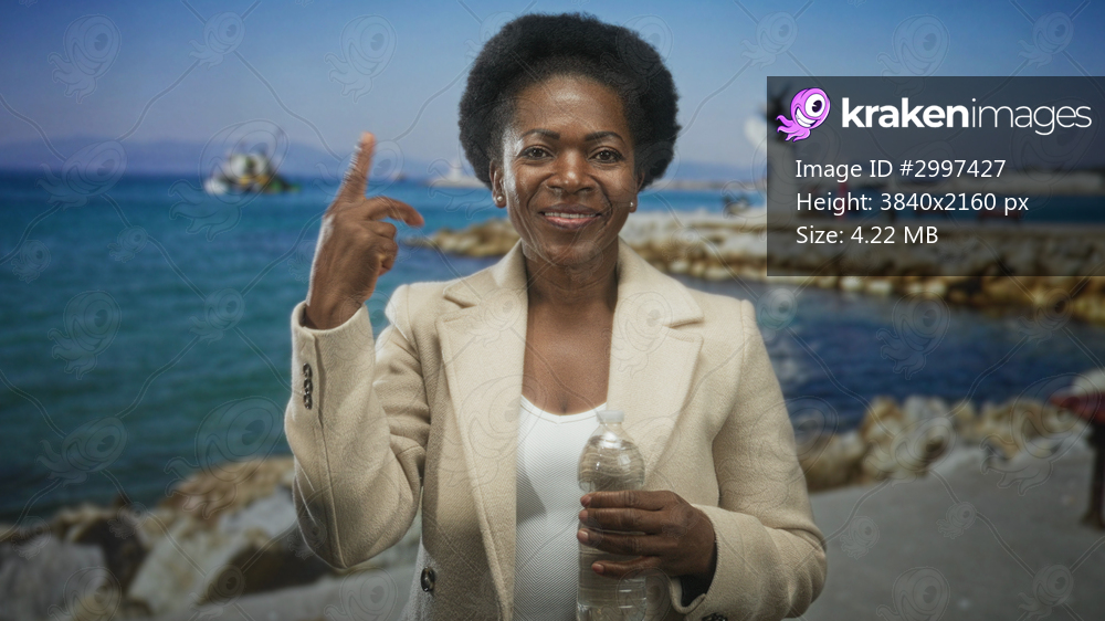 Woman african black in beige coat holding water bottle smiles and points finger to camera on a seaside street near rocky pier and sculpture; confidence resilience. - Kraken Images