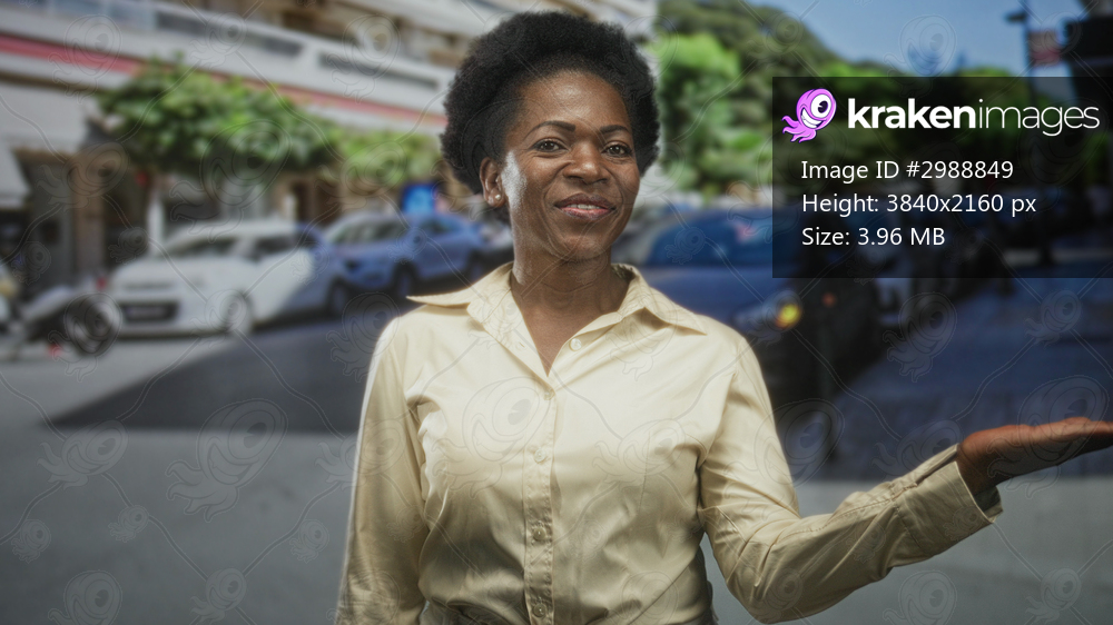 Woman african smiling, showing open right palm toward parked cars and trees on a sunny city street in front of storefronts; friendly welcome.