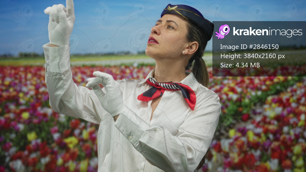 Woman air hostess adjusts gloves, tilts face toward sunlight and surveys tulip field at airport; calm professionalism.