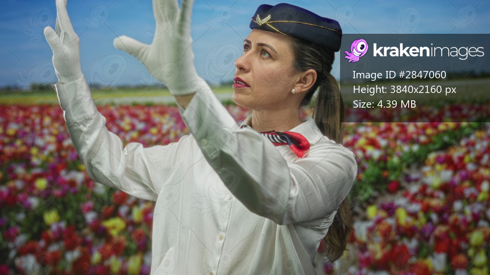 Woman air hostess adjusts gloves, tilts face toward sunlight and surveys tulip field at airport; calm professionalism.