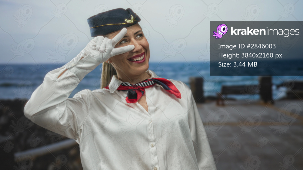 Woman air hostess displays peace sign with gloved hand on street promenade by seaside; cheerful greeting.