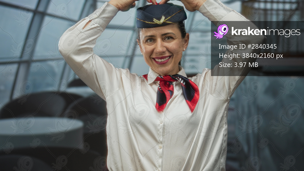 Woman air hostess forming heart shape with hands above her head at airport lounge interior; love devotion.