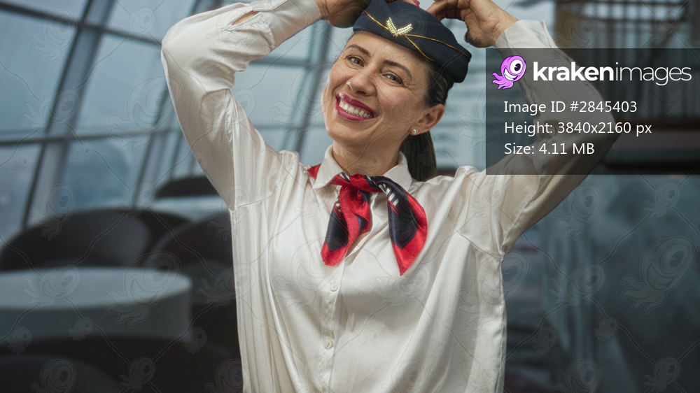 Woman air hostess forming heart shape with hands above her head at airport lounge interior; love devotion.