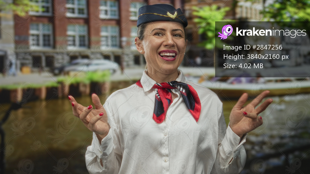 Woman air hostess in white blouse and red scarf pointing finger at camera on city street along canal; confidence.