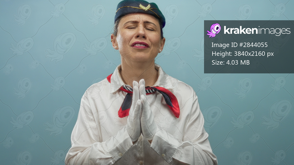 Woman air hostess wearing white shirt gloves and cap pressing hands together against light blue studio wall; hope.