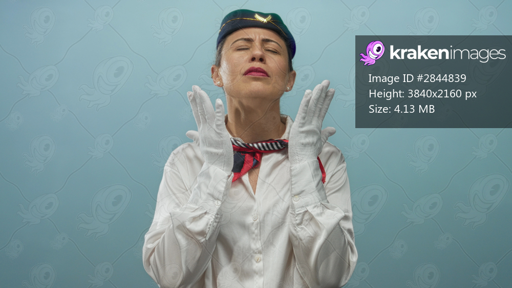 Woman air hostess wearing white shirt gloves and cap pressing hands together against light blue studio wall; hope.
