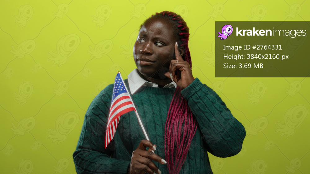 Woman with american flag stands isolated against yellow wall expressing various emotions highlighting patriotism and diversity in united states.