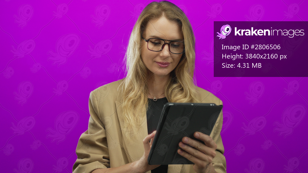 Woman analyzing tablet wearing blazer with glasses on pink background.