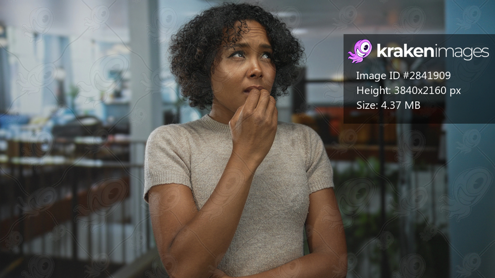 Woman with anxious gaze biting her fingernails in a spacious building atrium by a railing under soft lighting; anxiety.