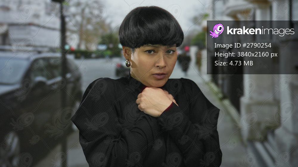 Woman anxiously crossing arms on city street in urban setting wears black sweater showing nervous expression outdoors during daytime