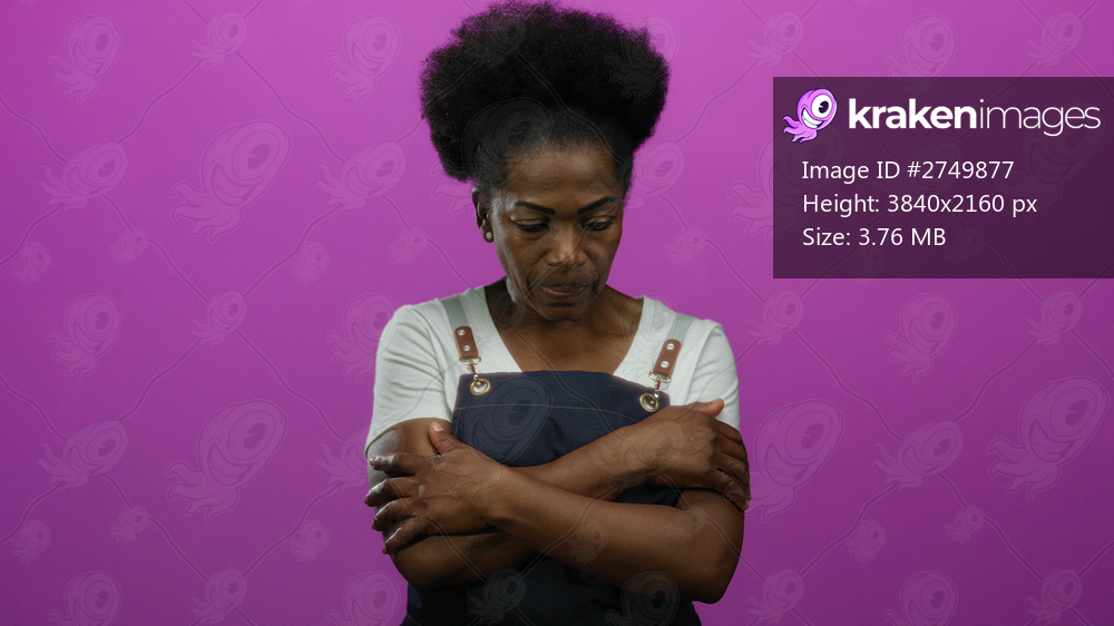 Woman appearing thoughtful wearing an apron against a vibrant pink background, embodying an isolated and introspective mood.