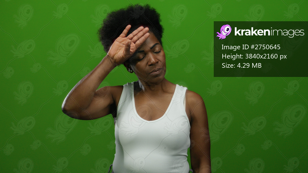 Woman appearing tired stands with eyes closed and hand on forehead against a vibrant green background conveying fatigue and solitude.