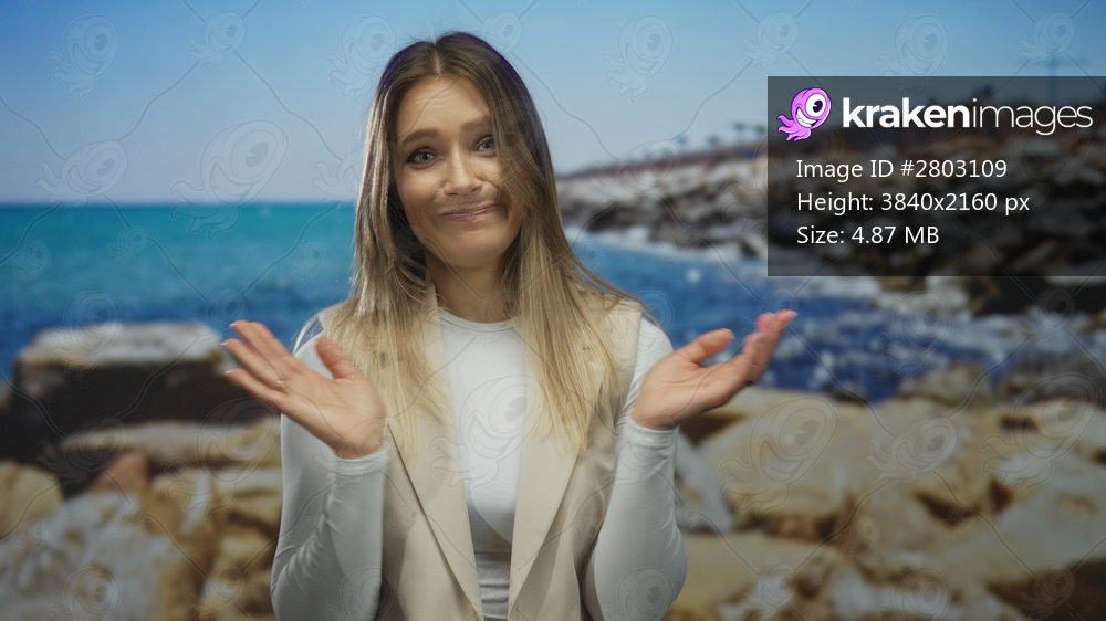 Woman applauding on sunny beach with blonde hair wearing casual clothing beside sea and rocks outdoors giving a joyful expression under clear blue sky. - Kraken Images