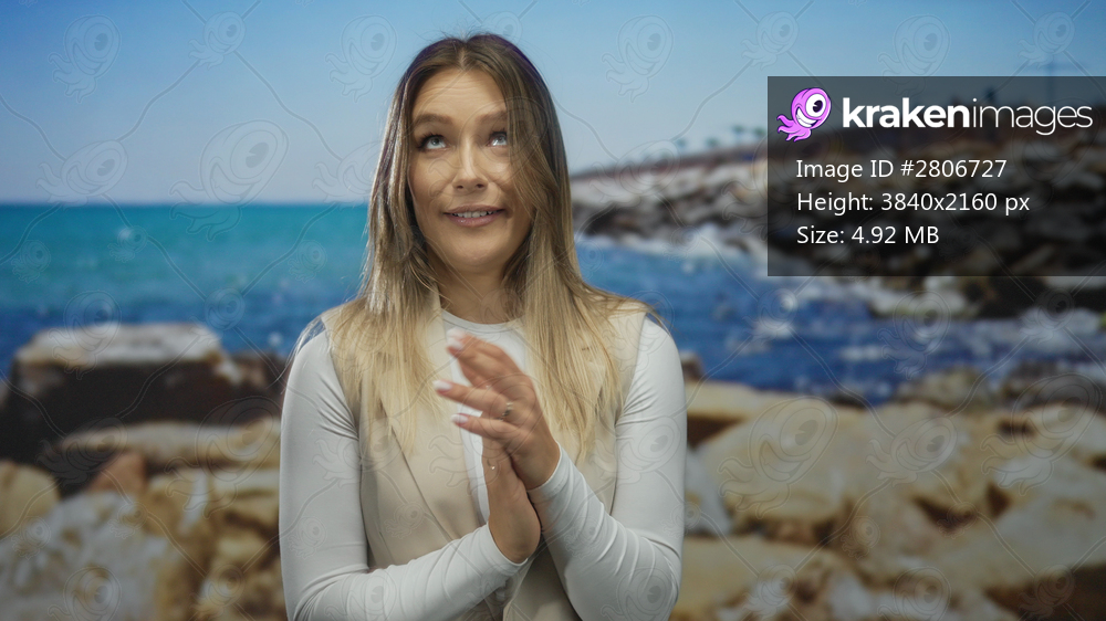 Woman applauding on sunny beach with blonde hair wearing casual clothing beside sea and rocks outdoors giving a joyful expression under clear blue sky. - Kraken Images