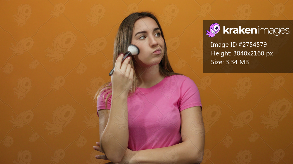Woman applying makeup with brush on orange background wearing pink shirt, showcasing beauty routine, young female enjoying cosmetics, isolated in a colorful setting.