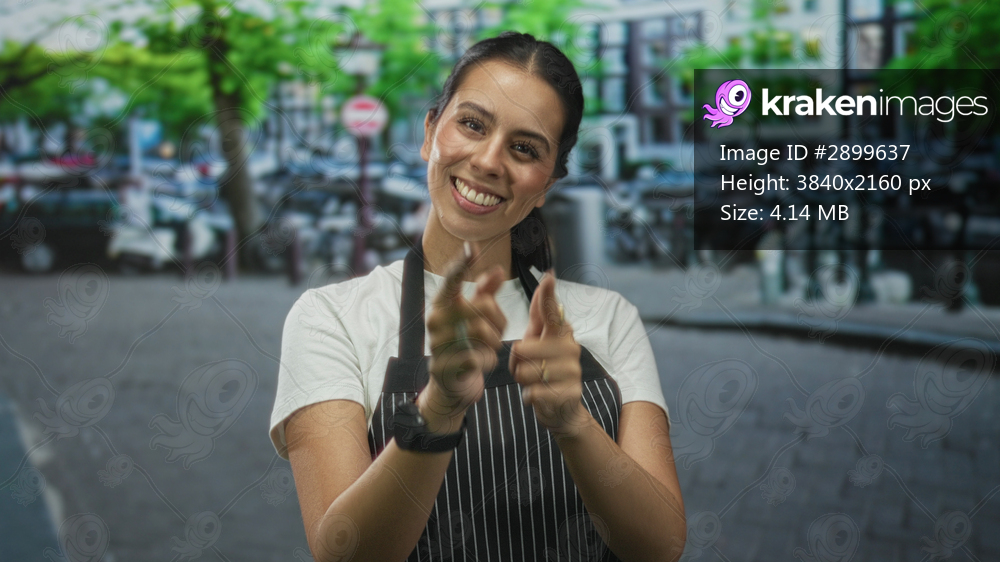 Woman with apron points finger at camera on city street while smiling broadly; cheerful playfulness.