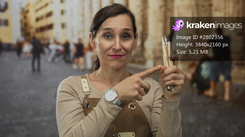 Woman with apron points to tools in hand on busy old town street with blurred passersby in background, capturing urban outdoor scene and hispanic female presence. - Kraken Images