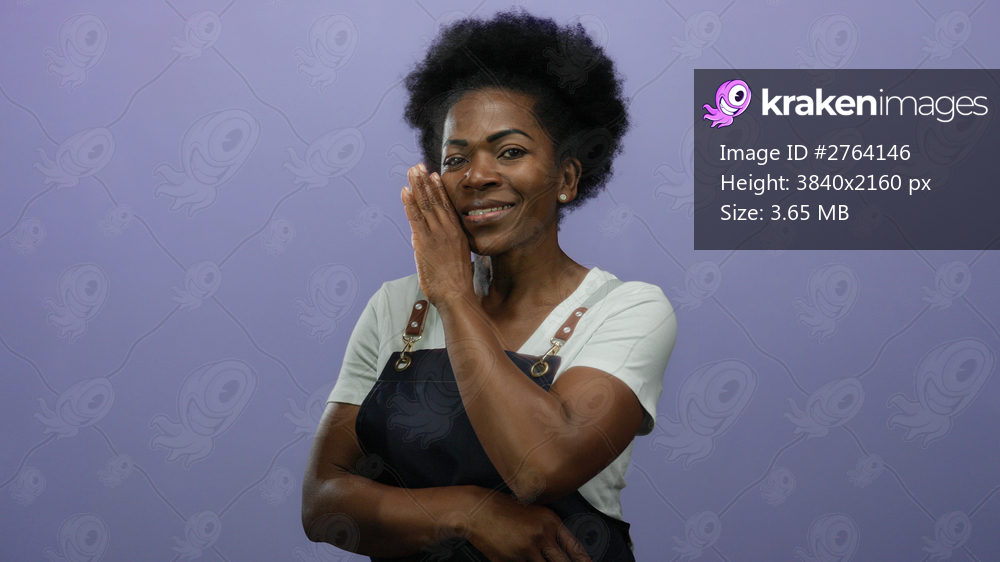 Woman with apron sharing secret on isolated purple background, conveying curiosity and confidentiality with expressive gesture, suggesting trustworthy communication.