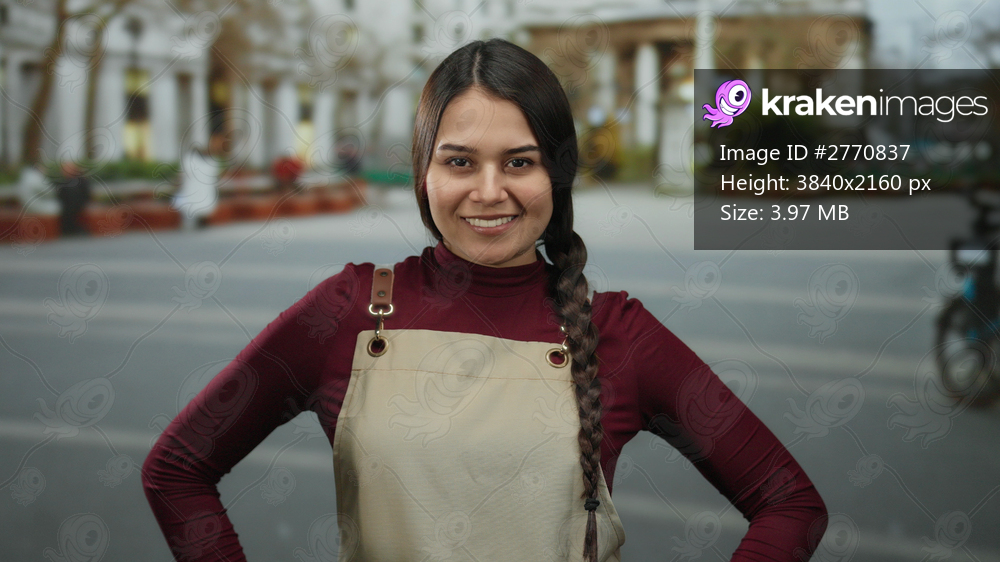 Woman with apron smiling confidently on an urban street with blurred background, showcasing young hispanic female as a waitress outdoors.