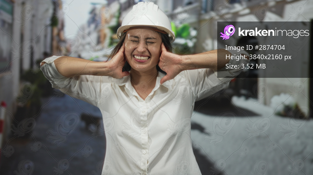 Woman architect covering ears with hands on street wearing hardhat and white shirt; stress overload noise.