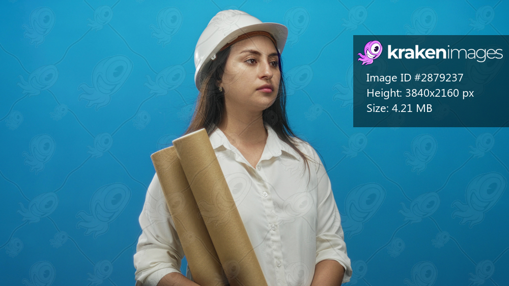 Woman architect holding two rolled plans and wearing a white hardhat while looking sideways in a blue studio; professional confidence ambition.