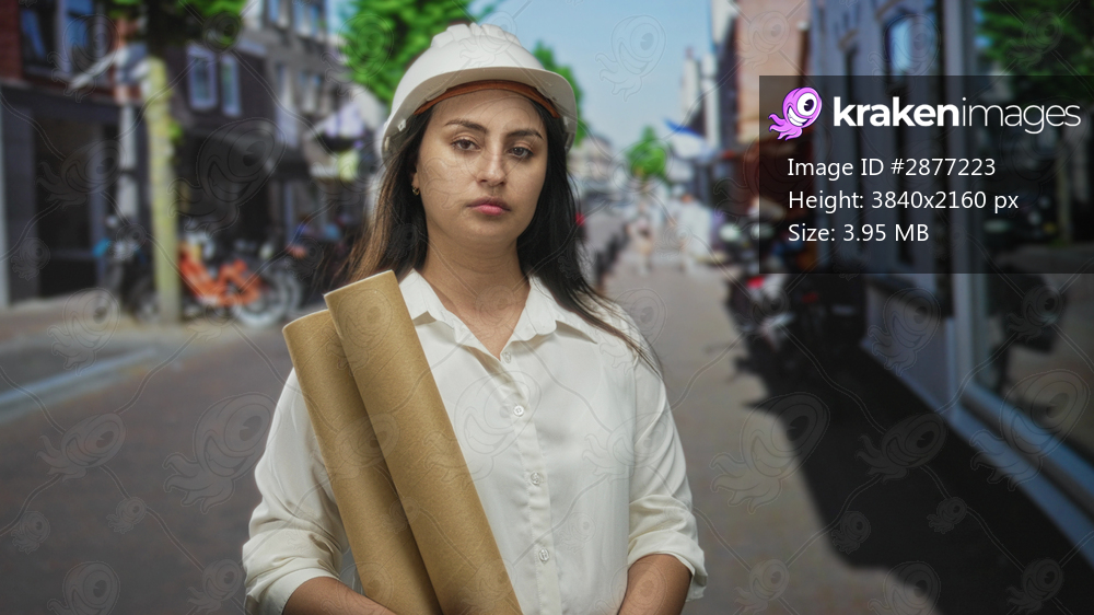 Woman architect in white hardhat holds rolled blueprints with hands visible on city street; determination planning ambition.