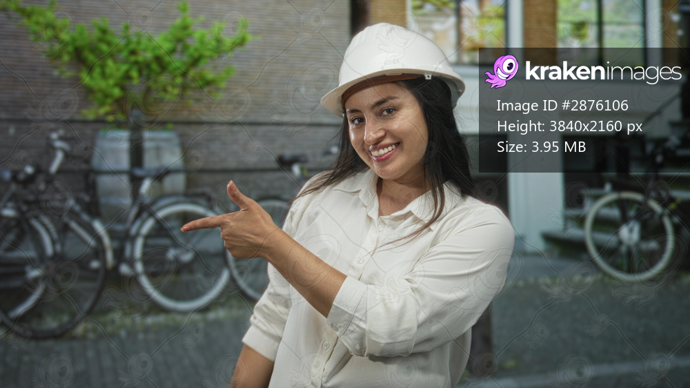 Woman architect in white hardhat points finger to side on street near bicycles and buildings; confidence.
