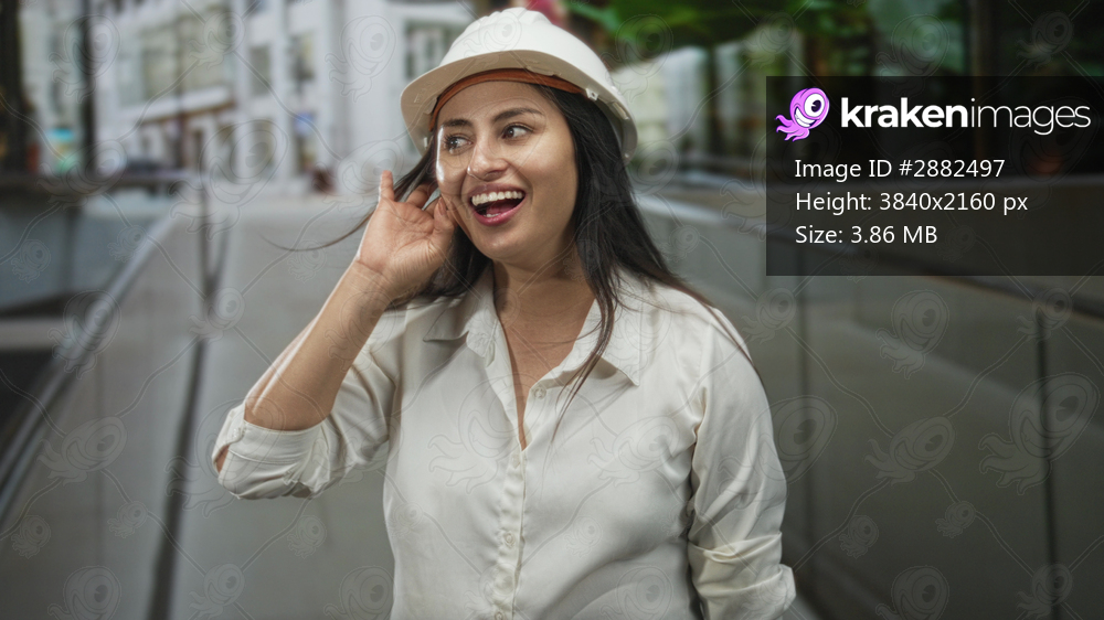Woman architect in white hardhat smiles, points finger at camera and gives thumbs up on a building ramp; confidence progress.