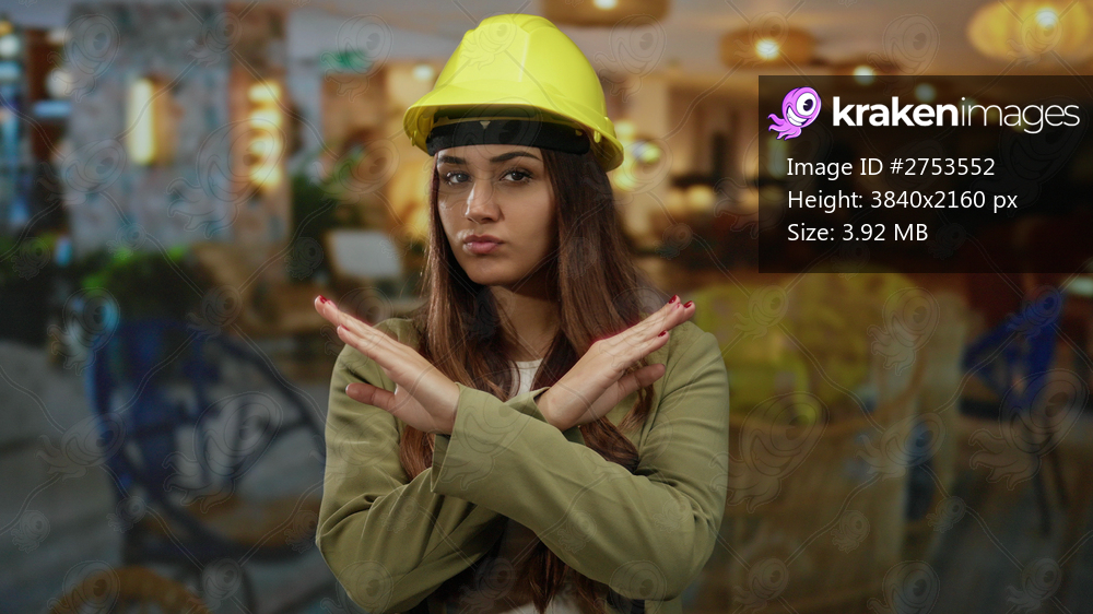Woman architect in yellow hardhat making x gesture indoors at stylish hotel lounge expressing refusal with strong professional stance