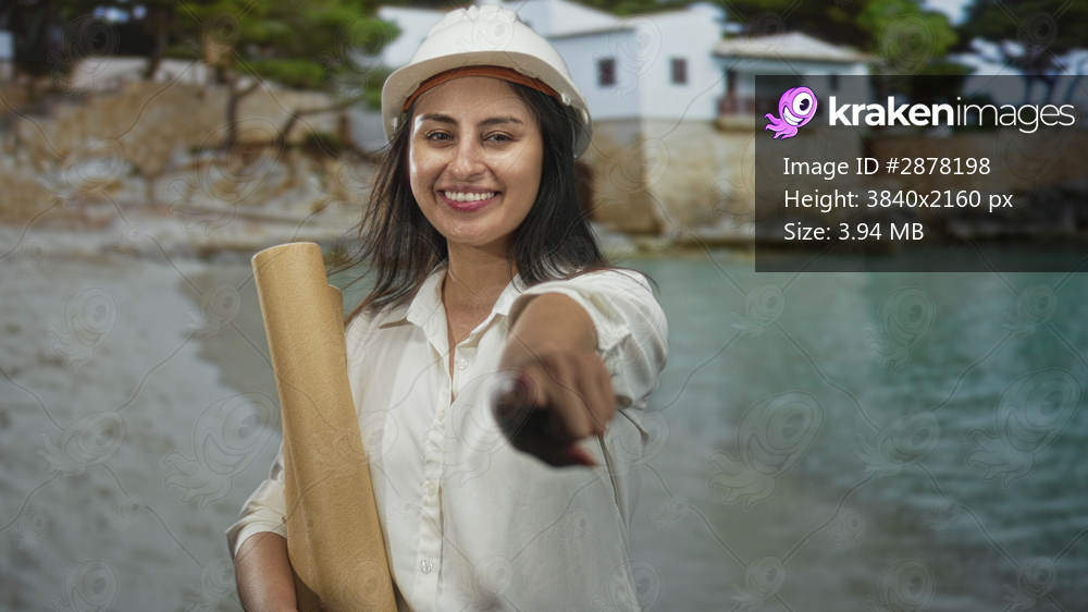 Woman architect points finger to camera holding blueprint at building site; confidence leadership progress.