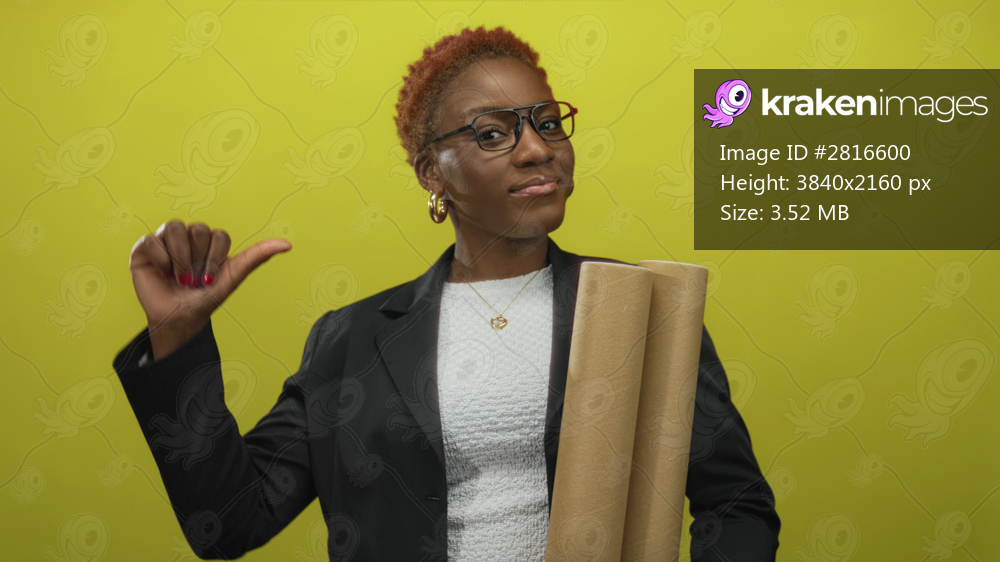 Woman architect standing and holding rolled blueprints in studio by yellow wall; ambition confidence.