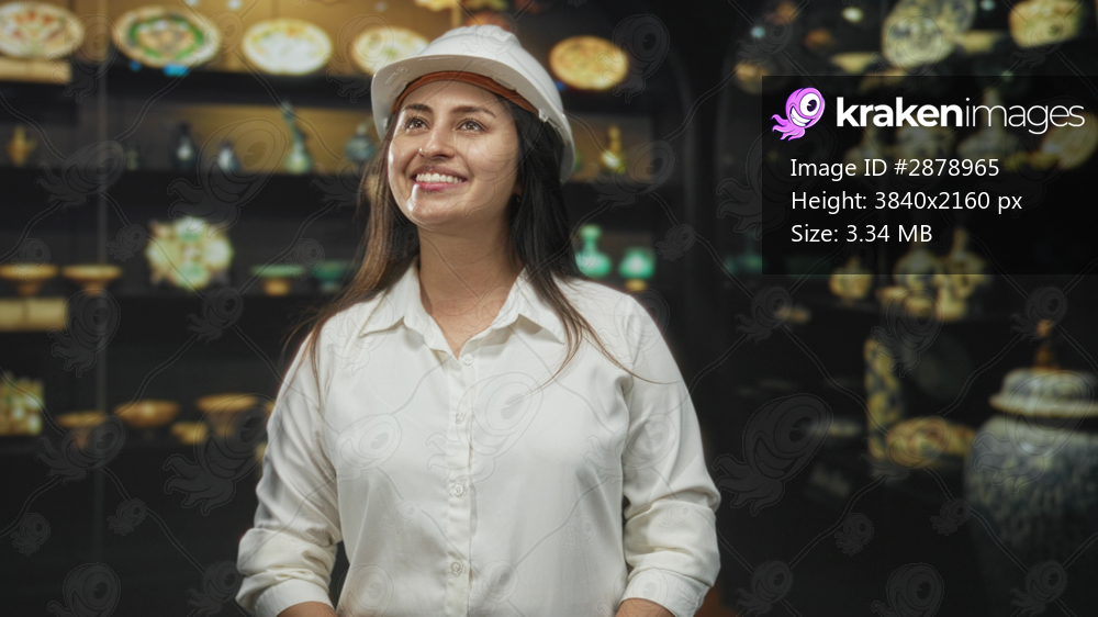 Woman architect wearing a hardhat, smiling and looking up at a museum exhibit in a historic building; curiosity heritage preservation.
