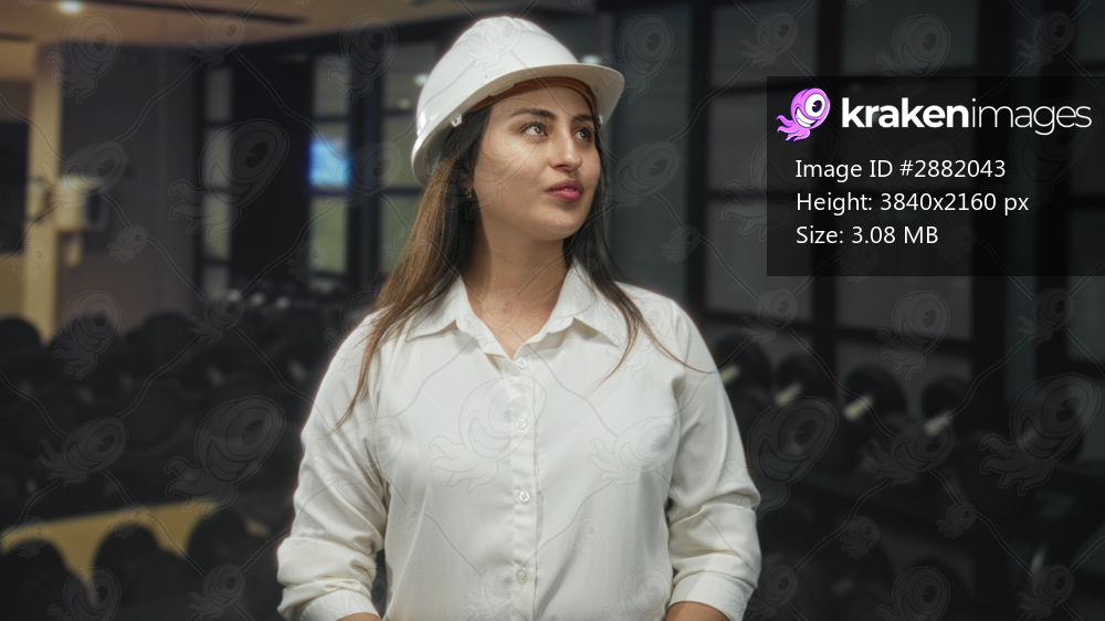 Woman architect wearing hardhat and white shirt looking up toward ceiling and gym dumbbells in building; confidence planning.