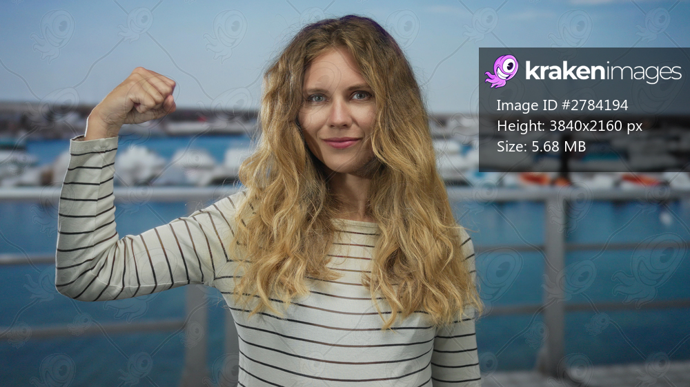 Woman arm flexing at marina setting embodies blonde young spirit by the harbor pier and radiates strength portrait.