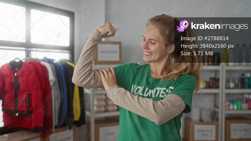Woman arm flexing charity blonde young volunteer donation smile confident conveys empowerment spirit.
