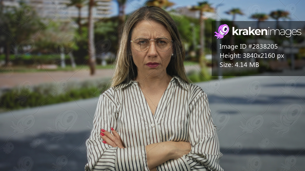 Woman with arms crossed and a stern frown stands on a sunlit street lined with palm trees and urban buildings; defiance.