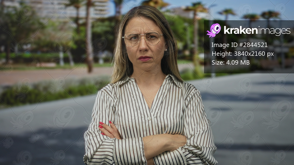 Woman with arms crossed and a stern frown stands on a sunlit street lined with palm trees and urban buildings; defiance.