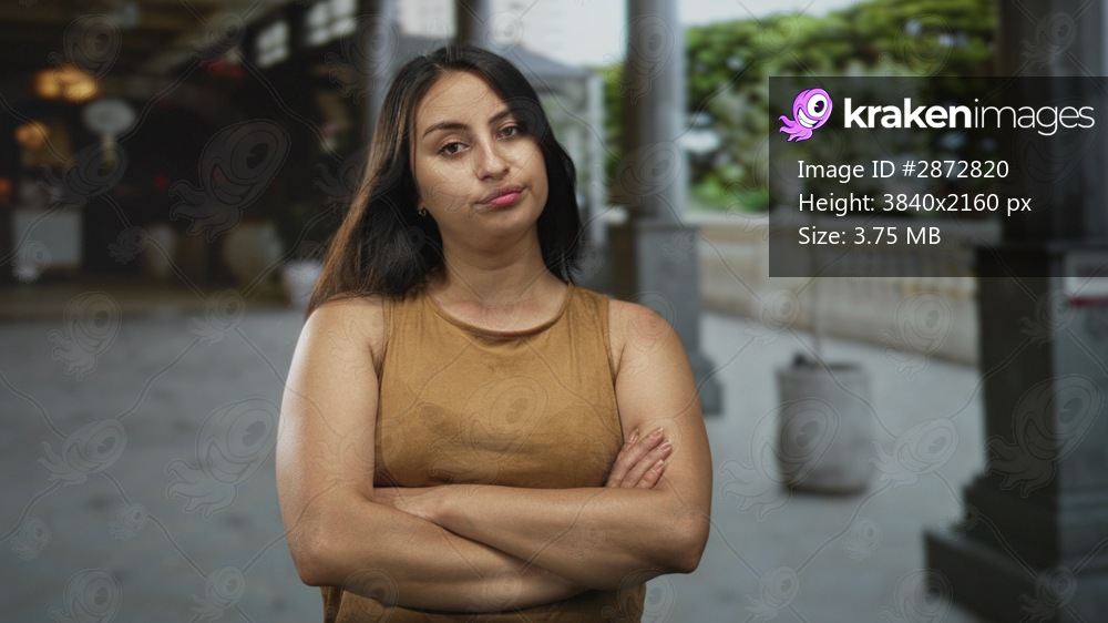 Woman with arms crossed at a building colonnade showing a skeptical pout and folded posture; annoyance defiance.