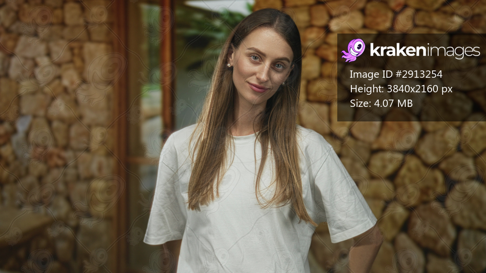 Woman with arms crossed at a house entrance beside a stacked stone wall, looking at camera with slight smile and relaxed posture; quiet confidence.