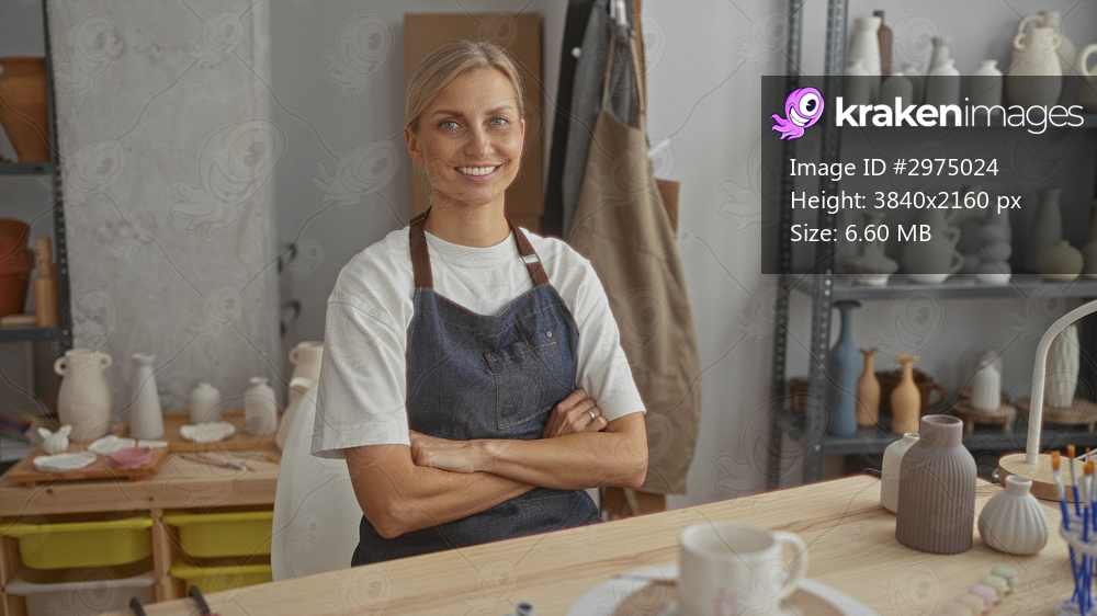Woman with arms crossed at pottery table surrounded by ceramic vases and brushes in a ceramics studio, smiling; contentment.