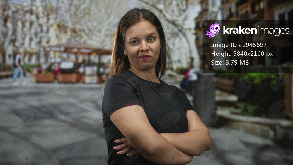 Woman with arms crossed, bare forearms visible, wearing black tshirt on a busy city street; confidence independence resilience.