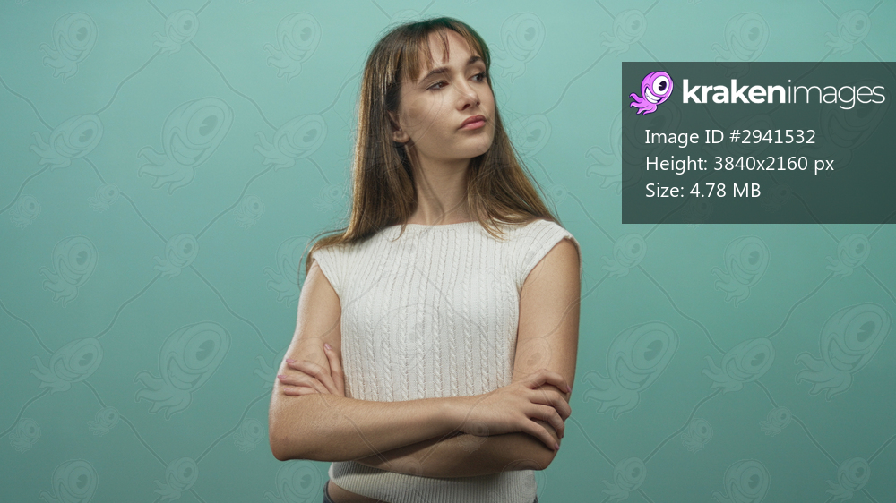Woman with arms crossed and bare forearms wearing white knit top in teal studio; confidence quiet determination.