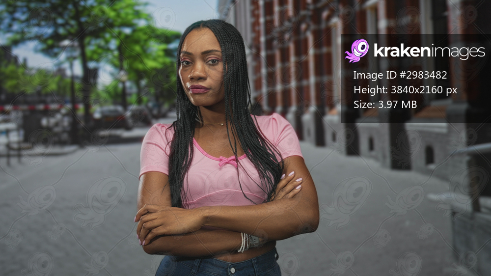 Woman with arms crossed, braided hair, pink cropped top and jeans, bracelets and nails visible, standing on a street beside a brick building and parked cars; disapproval. - Kraken Images