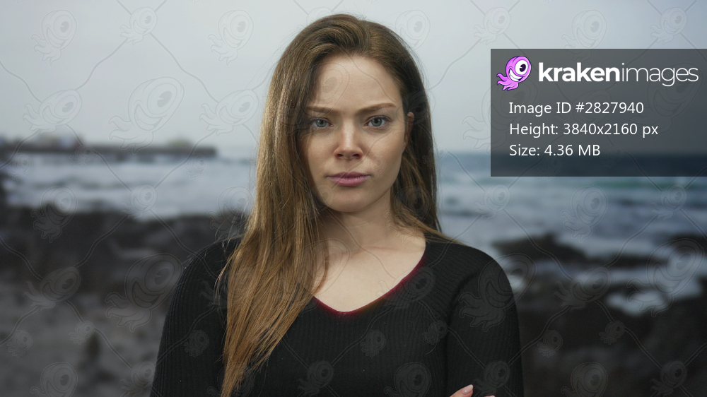 Woman with arms crossed and closed eyes standing beside rocky seaside shore under overcast sky; rejection.