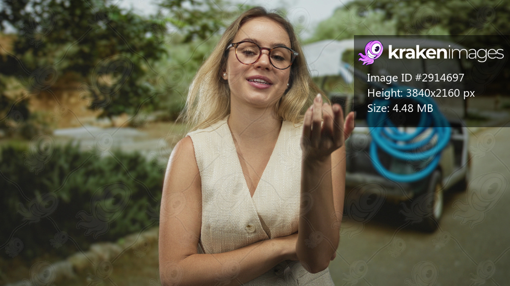 Woman with arms crossed and fingers beckoning, smiling, wearing glasses and blonde hair on a street beside a golf cart; confidence ease.