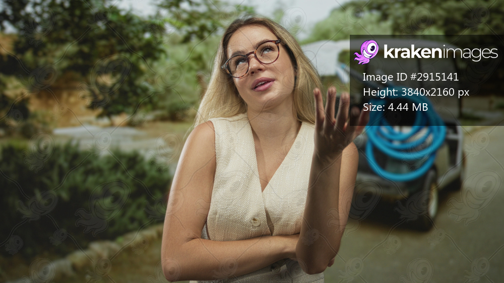 Woman with arms crossed and fingers beckoning, smiling, wearing glasses and blonde hair on a street beside a golf cart; confidence ease.