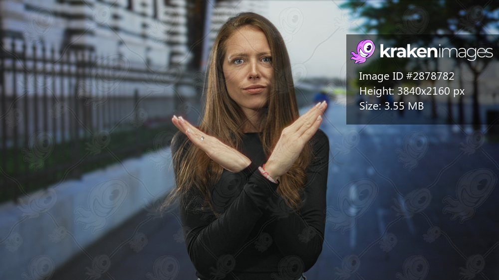 Woman with arms crossed forming an x, palms and fingers visible, standing by a street fence near a building in daylight wearing black; rejection.
