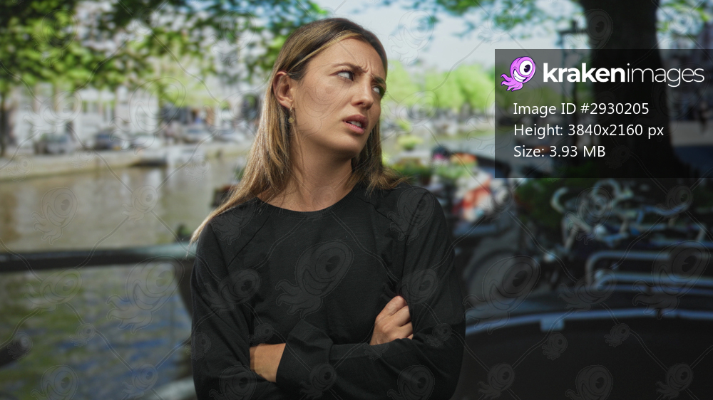 Woman with arms crossed, furrowed brow and pursed lips on amsterdam canal street with parked bicycles and moored boats by bridge; frustration urban moment. - Kraken Images