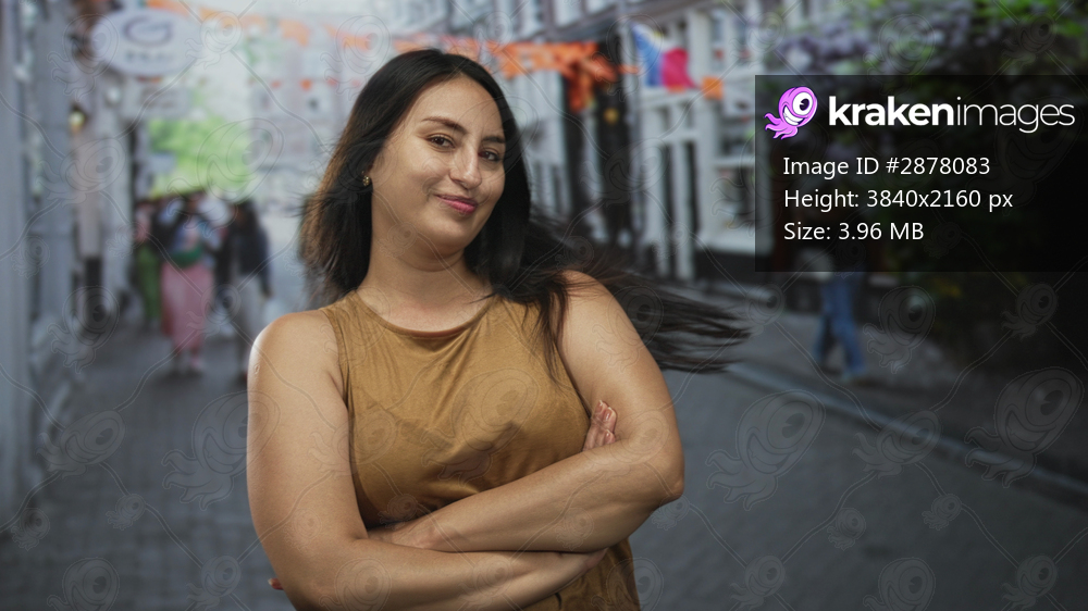 Woman with arms crossed and hair swept while wearing a sleeveless top on a narrow city street with storefronts and bunting; confidence self belief.