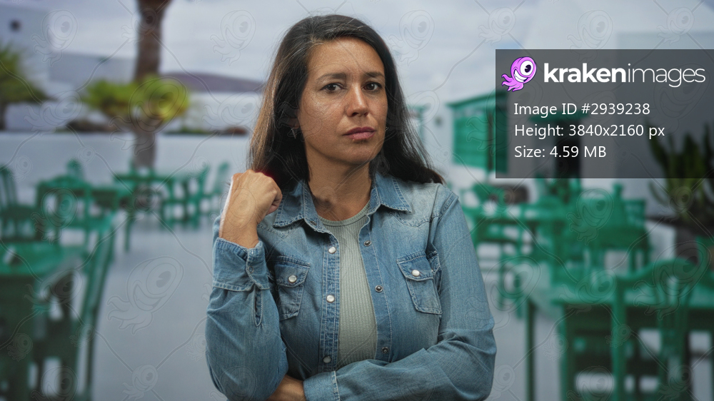 Woman with arms crossed and hand on elbow wearing denim jacket in front of green chairs and white building, looking displeased; mild disapproval.